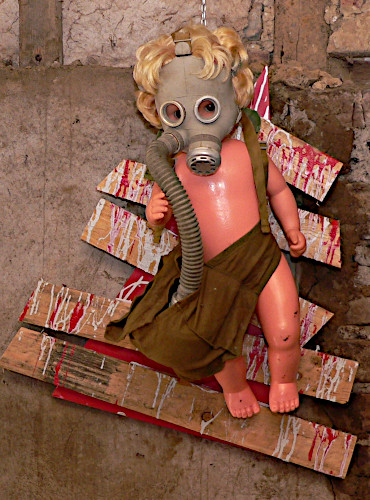 Insgesamt ist die Darstellung einer Puppe mit Gasmaske in diesem Kunstwerk ein eindringliches Mahnmal gegen die Folgen von Krieg für die jüngste Generation. Es appelliert an die Menschlichkeit und die Verantwortung der Gesellschaft, Kinder vor solchen Gräueltaten zu schützen und Frieden zu schaffen.